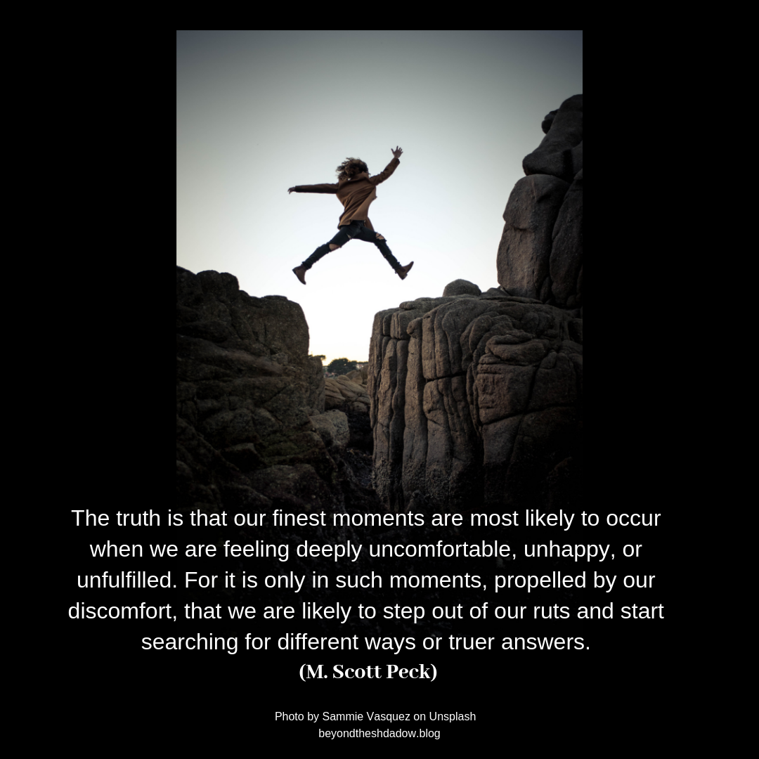 The truth is that our finest moments are most likely to occur when we are feeling deeply uncomfortable, unhappy, or unfulfilled. For it is only in such moments, propelled by our discomfort, that we are likely to step out of our ruts and start searching for different ways or truer answers.