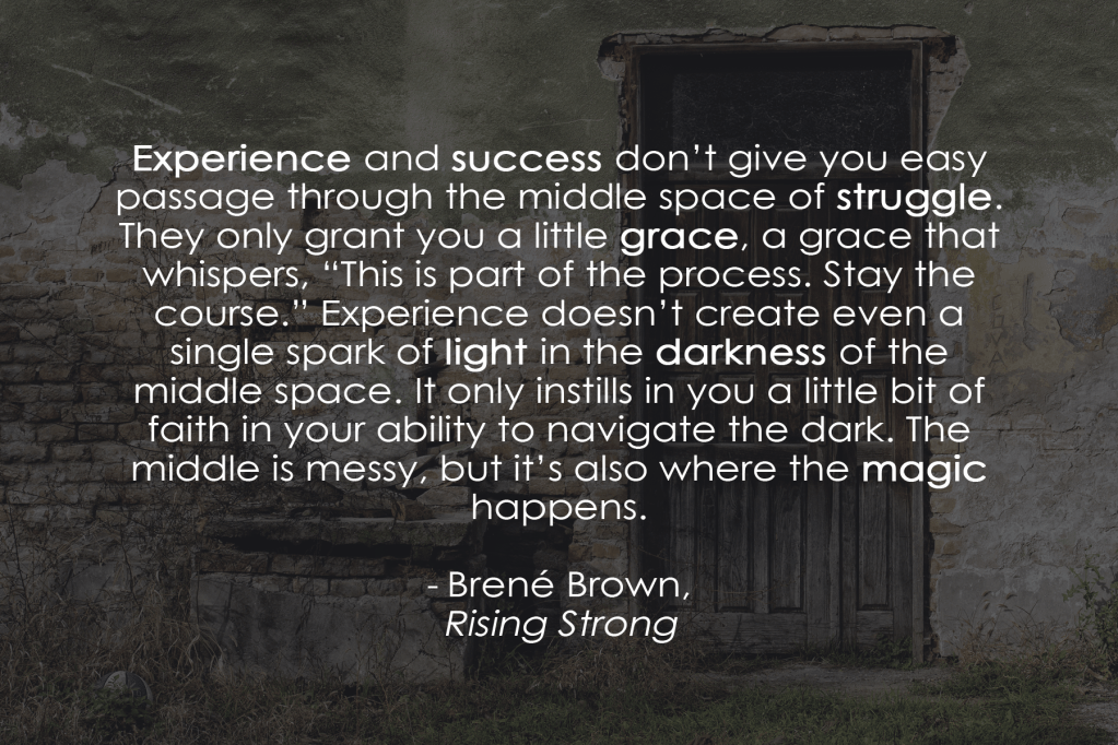 The true power and growth available and the possible gift of this moment, are learning how to be in the dark and challenging spaces of life and also learning that the darkness will not ultimately overcome us.