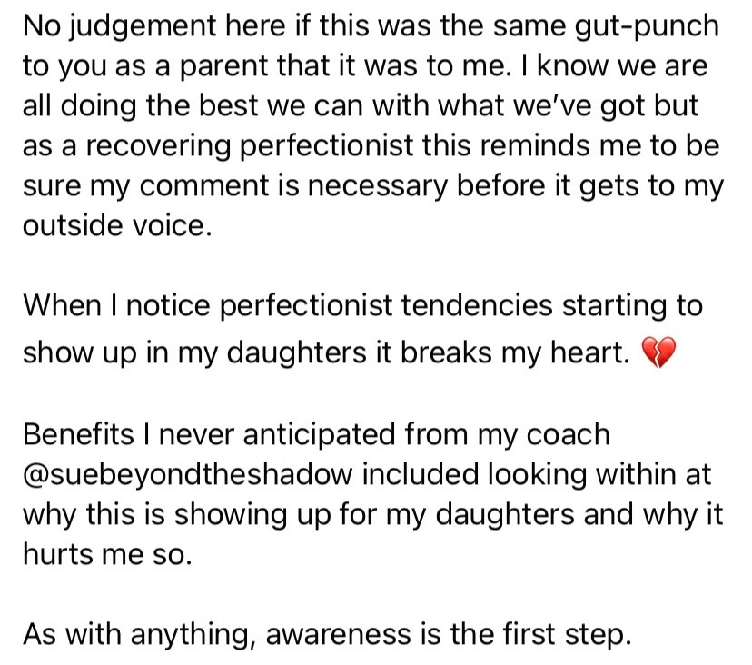 I had a lovely comment about our coaching from one of my clients this week. She posted an image on Facebook that said, “When you keep criticizing your kids, they don’t stop loving you. They stop loving themselves. Let that sink in.” I love her insight, the work she is doing and that she is willing to share it with others.