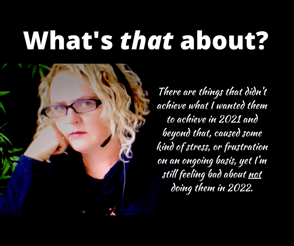 Reflecting on my not-to-do list, I realized I’m uncomfortable, even sad, about some of what I’ve written. What? That’s right. There are things that didn’t achieve what I wanted them to achieve in 2021 and beyond that, caused some kind of stress, or frustration on an ongoing basis, yet I’m still feeling bad about not doing them in 2022? Here is the reason: There are things on this don’t-do list that reflect my deep values and beliefs despite not accomplishing what I wanted them to achieve. As a result, they are on this year’s don’t-do list. My grief about some of what is on this list, is the thought that I need to let go not only of the activity itself, but also this thing I really want in my life – the aspiration behind the activity.