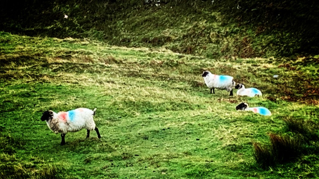 A lot of the sheep are spray painted – red, blue, purple. It seems weird. I can’t understand why. It’s a bit difficult to find a sheep that’s not spray painted so that I can take a photo. The spray paint is messing with my idea of what a sheep in a grassy pasture should look like.