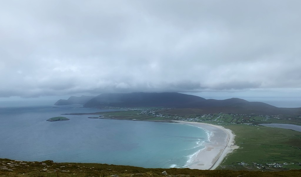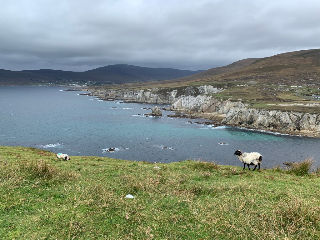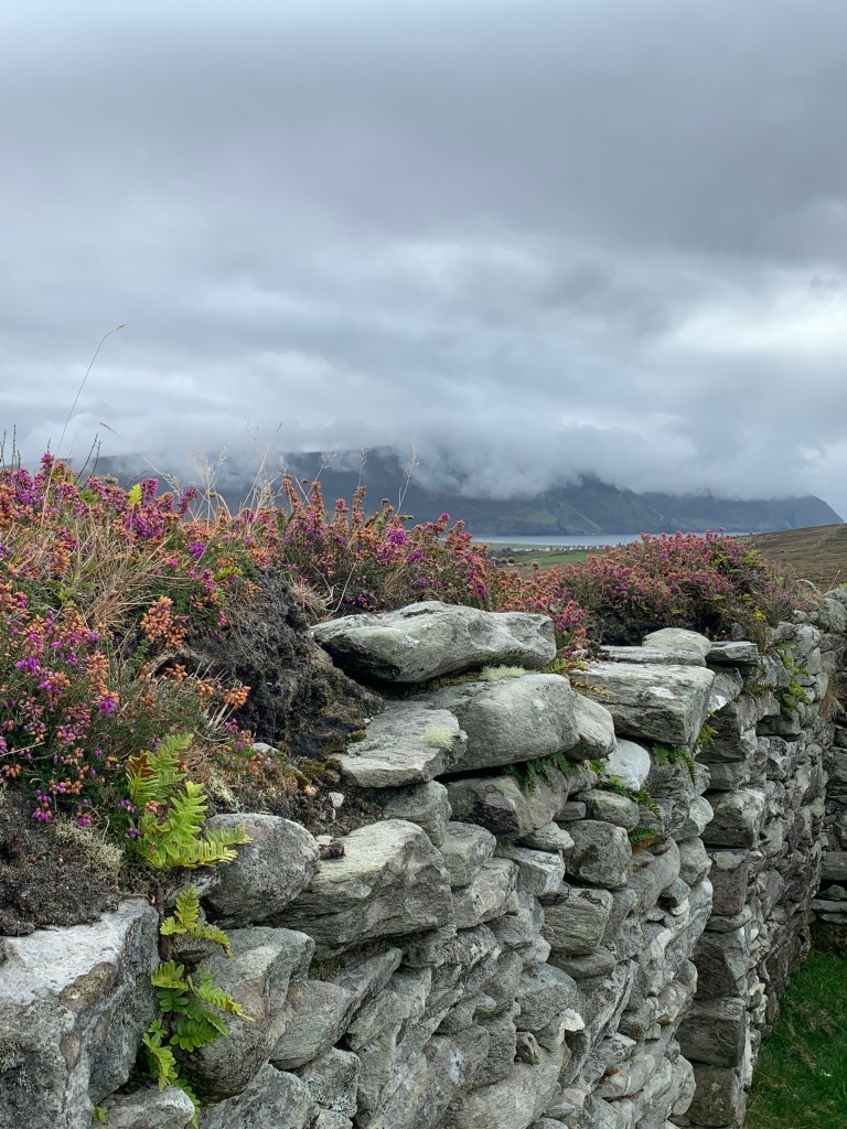 After we’ve finished at The Deserted Village, we head to our next destination, the top of Minaun, another viewing point. We drive up a mountainside. It gets progressively windier as we near the top. As we get out to wander around a bit, I’m glad we made the choice not to hike up to the highest sea cliffs at Keem. I believe there is quite a steep drop off and nothing to keep you from falling if the wind decides to be gusty. This mountain has a gentler slope. The wind is strong enough to feel like it would be good not to get too close to the edge of anything.  We can see the bay and figure we can pinpoint the general area of our Airbnb from there.