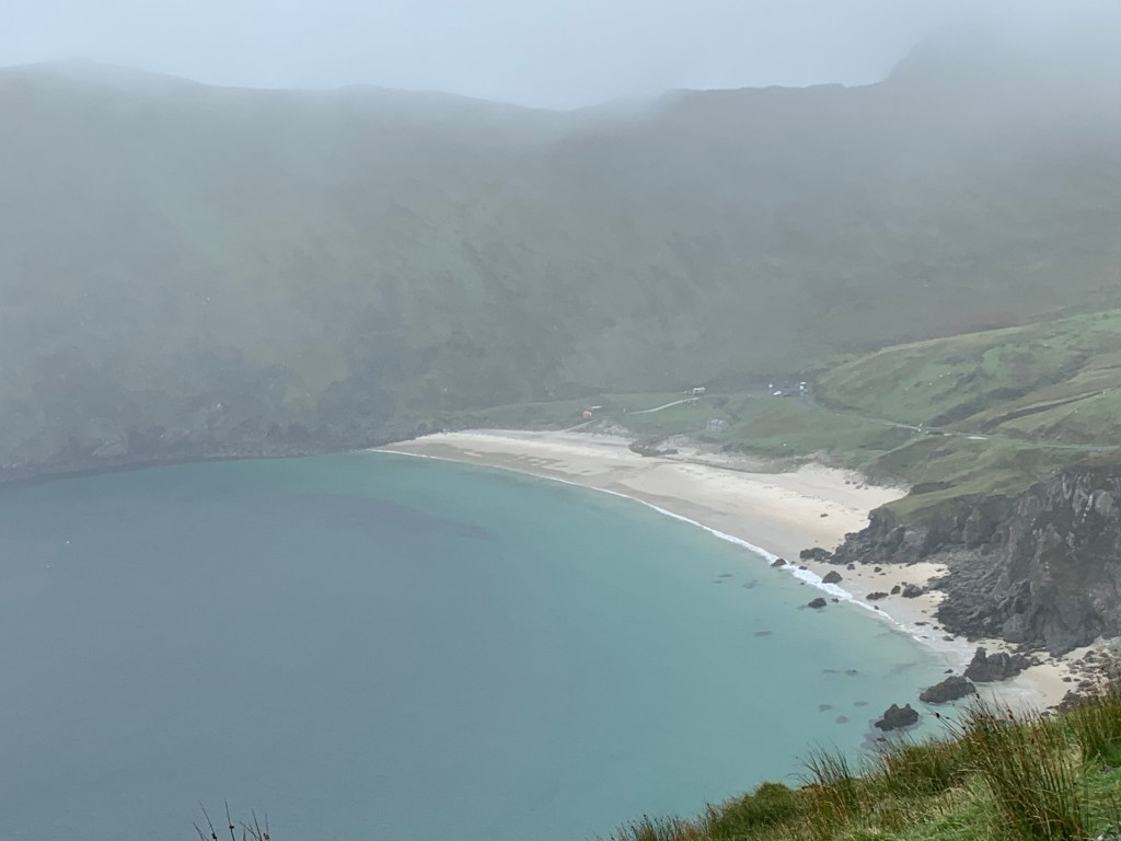 I want to head to Keem first. The guide says there is a strenuous hike there to the highest sea cliffs in Europe – only for experienced hikers. We are not experienced hikers, but the view I imagine we might see appeals to me. The book says the weather can change very quickly once you are up there so to proceed with caution. We drive a winding road along the sea with the misty drizzle making it all feel very Irish to me. As we round the bend, we see the steep mountain we’d have to climb to get to the highest sea cliffs and a magical beach below. We decide not to hike. The mountain is shrouded in mist. Instead, we sit in our car enjoying the view for a while. Even though it is so gorgeous, I am not tempted to swim. It’s rainy and not very warm.